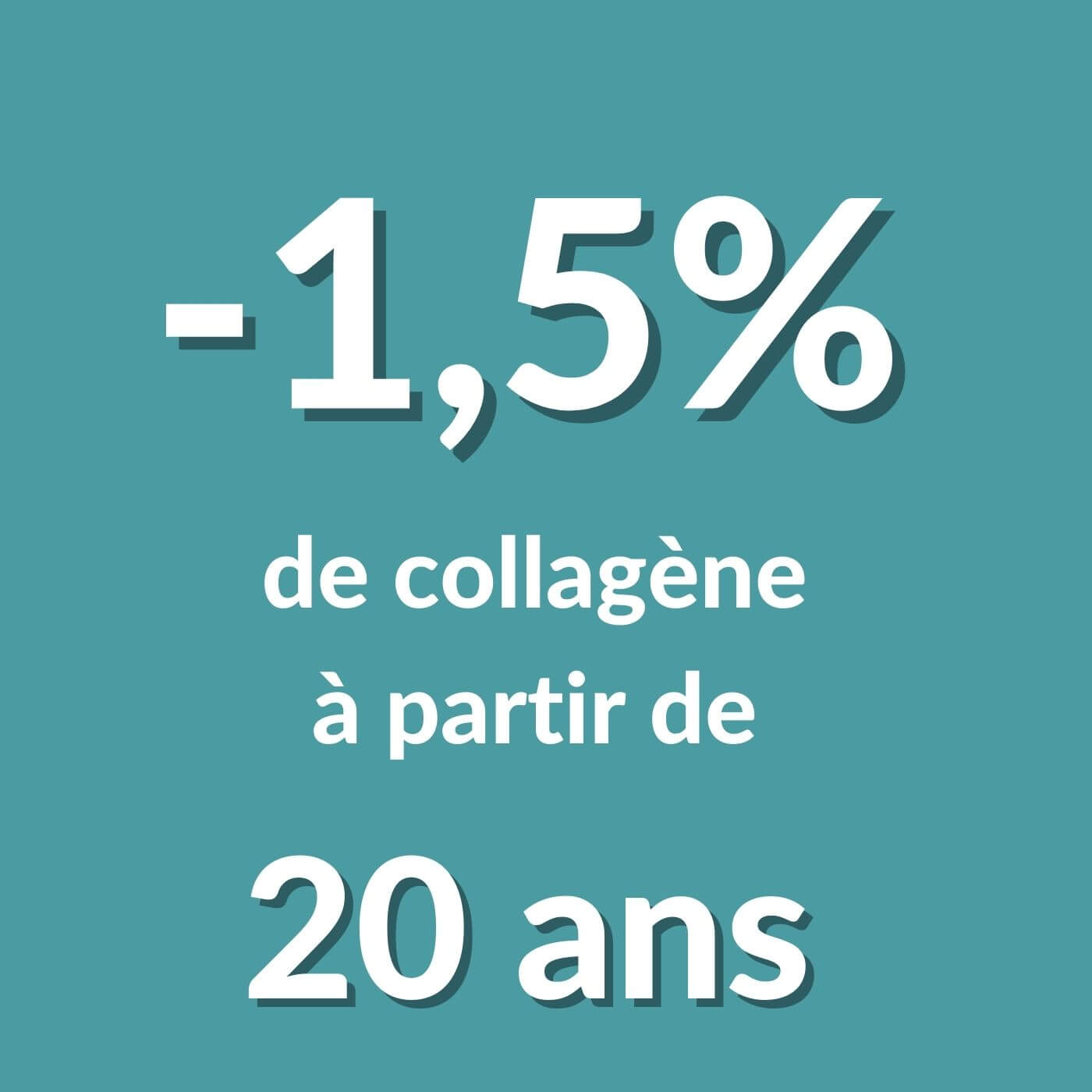 Comme mentionné plus haut, vous produisez en moyenne 1 à 1,5 % de collagène en moins tous les ans, à partir de l'âge de 20 ans, et cette perte ne fait que s'accélérer au fil des années.