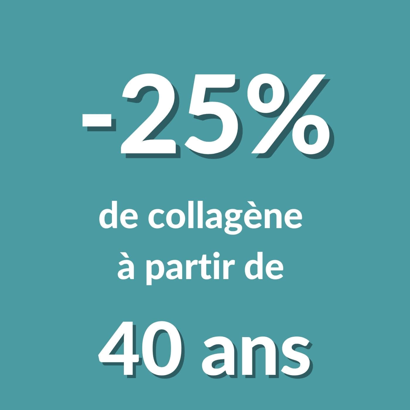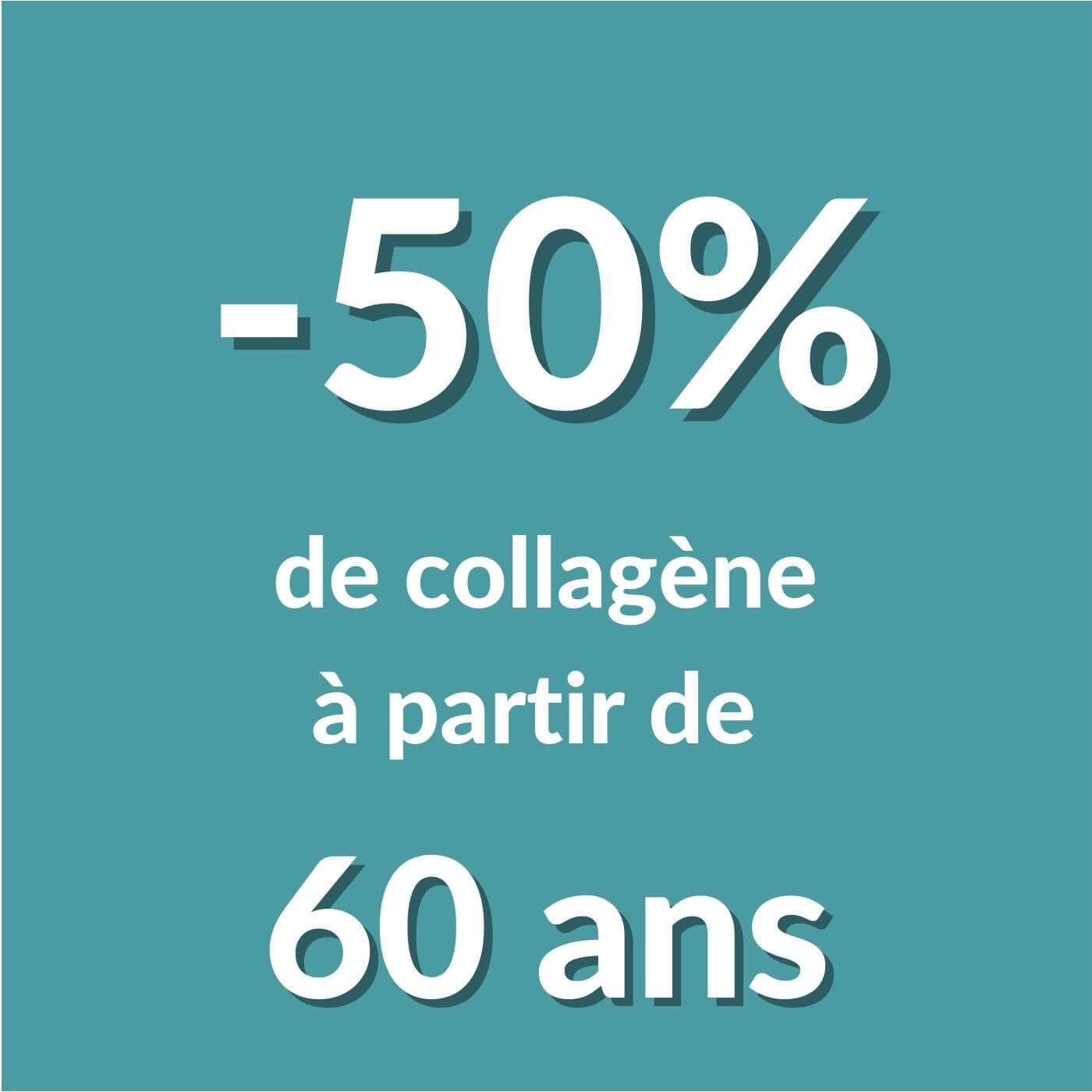 Sans une bonne supplémentation, vous produisez alors, en moyenne, 25 % de collagène en moins à l'âge de 40 ans, et à 60 ans, votre corps produit 50 % de collagène en moins !